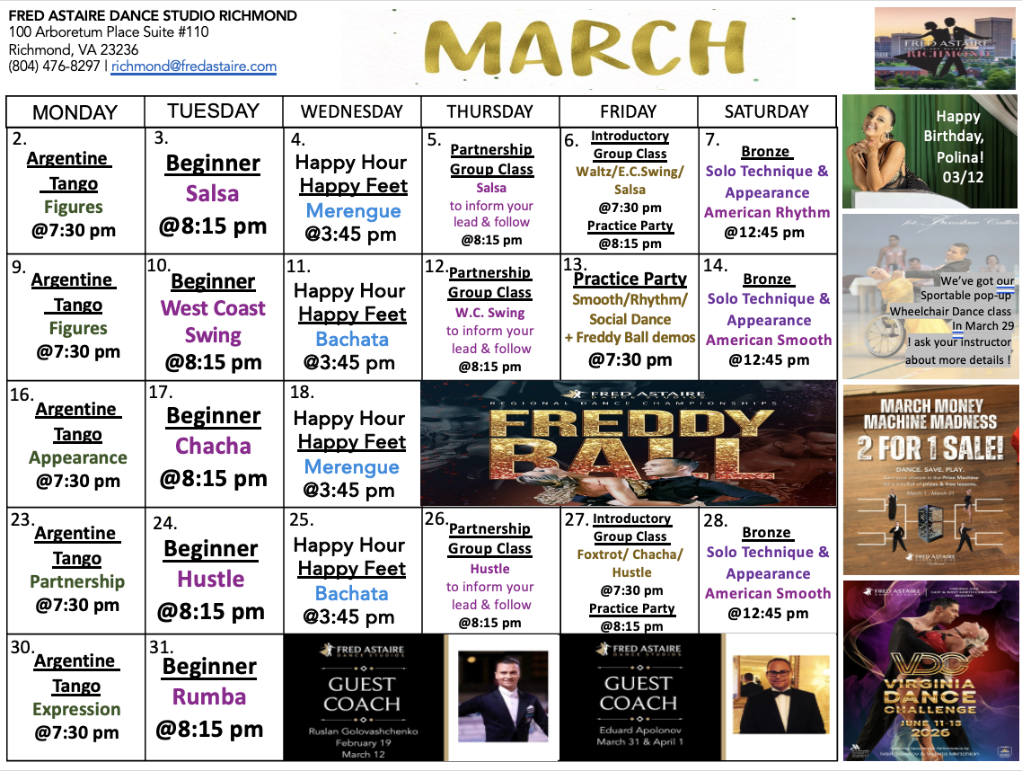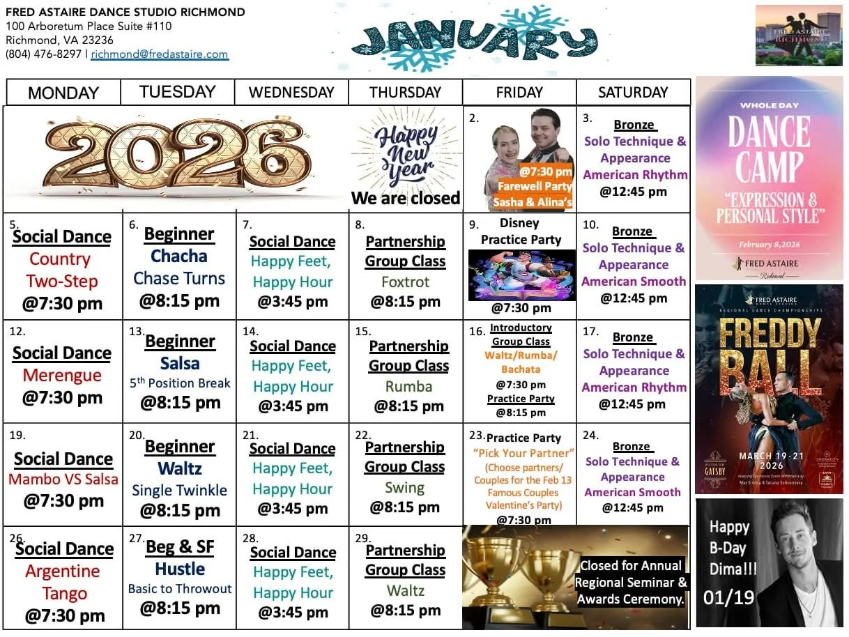 Our monthly studio calendar of what's happening in the studio: group classes, dance parties, practice parties, events, social outings, and competitions!